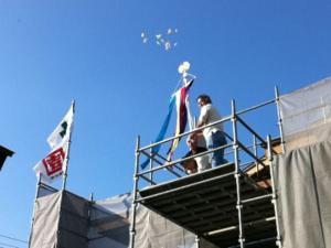 五色の旗を立て、工匠の神に祈りを捧げました。その後、気持の良い天候の中、餅まきも行われ、近所の皆さんも含め楽しく餅拾いをしていました。