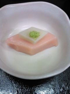 左の写真は、先付として出した「ひし餅風のごま豆腐」です。