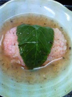 ごまくず豆腐に桜の花びらを練り込みました。桜の花の形にし、ワサビと板長自慢の「わりしょうゆ」でお召し上がりいただきました。
