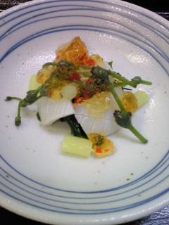 左の写真は、先日の夏のコース料理からの一品で「真イカと太刀魚(たちうお)の酢の物です。