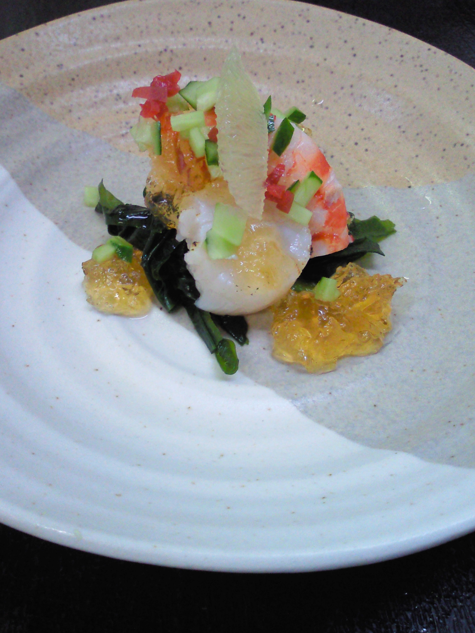 生かしてご用意しています。このエビのプリプリの食感&ホタテのやわら かさや甘味・・・お客様に大絶賛いただきました。