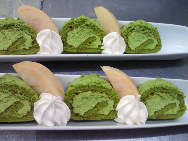 写真は、夏の時期のもので、「抹茶ロールケーキ&季節のフルーツ(桃)」です。