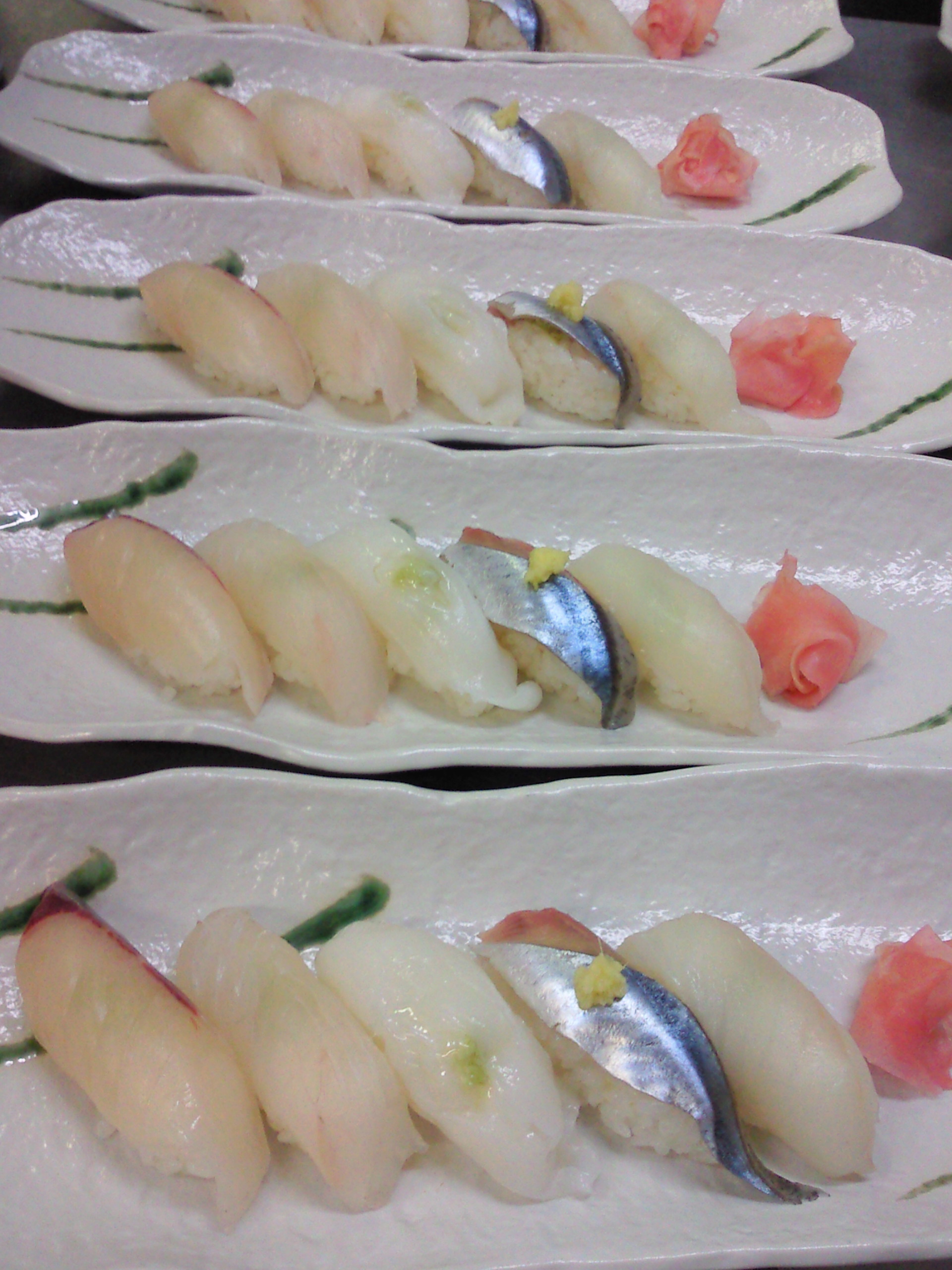 こちらのお寿しは、左から「縞鯵(しまあじ)・鮃(ひらめ)・活蛸(かつたこ)・秋刀魚(さんま)・虎魚(おこぜ)」の五貫でしたー!!