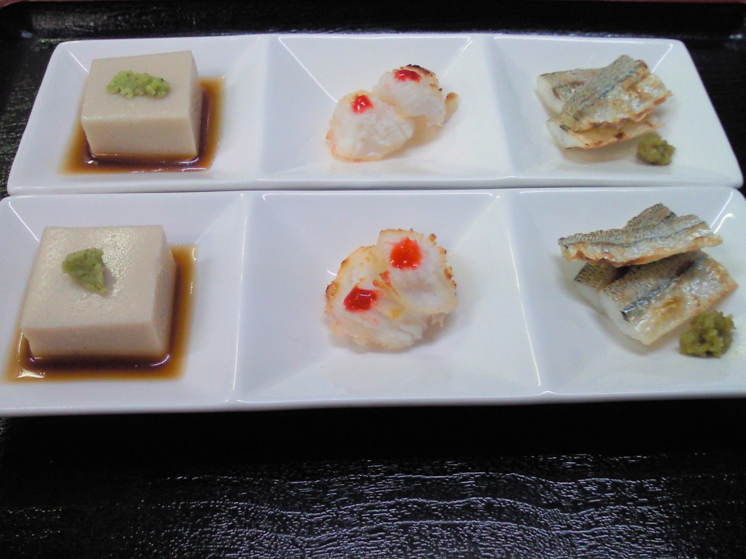 こちらのお写真は、お一人様¥5000円以上のコース料理をご予約でいただいた時の先付けです。(ゴマ豆腐・蛸の焼き物・細魚の酒焼き)