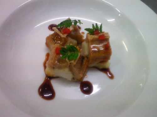 こちらは、穴子(あなご)とポテト(じゃがいも)で、いも寿司にしてみました。コース料理の一品、創作料理です。見た目もお洒落で女性のお客様にも、喜んでいただきました。