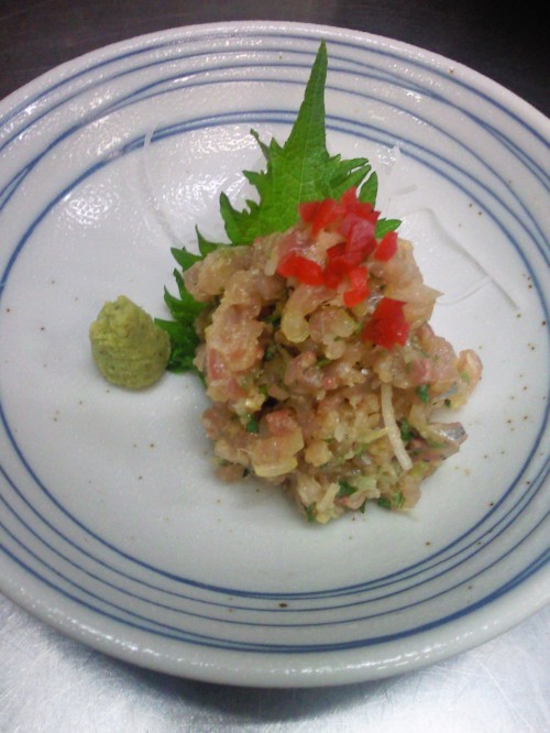 ●こちらは「なめろう」です!鯵(あじ)のお造りが大好きなお客様から「なめろうにしてもらえっか?」とのリクエストをいただいてご用意させていただきました。