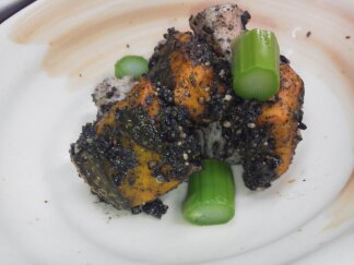 こちらの写真は、先日のお通しで「揚げ南京と貝柱のゴマよごし」という和食的な名前の付いた、カボチャと貝柱の胡麻和えです♪