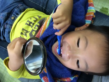 ●先日、三男の保育園で、歯科保健教室がありました♪歯磨きの大切さを人形劇でわかりやすく教えてくれたり、歯の磨き方の指導など、磨き残しを赤く染め出し、勉強しました。