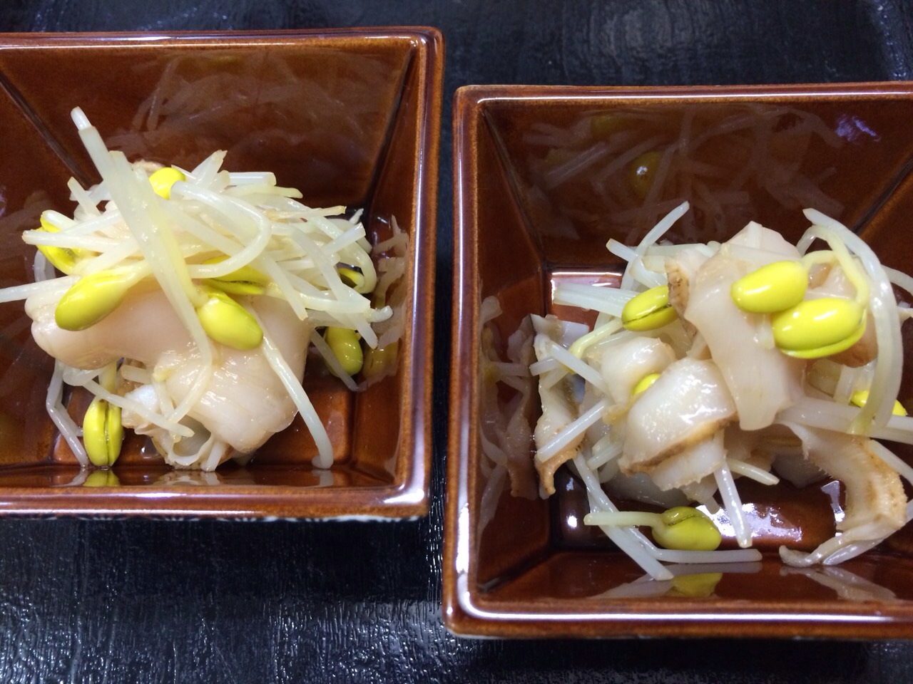 こちらは「豆もやしとホタテ(貝柱・ひも入り)のポン酢和え」です!