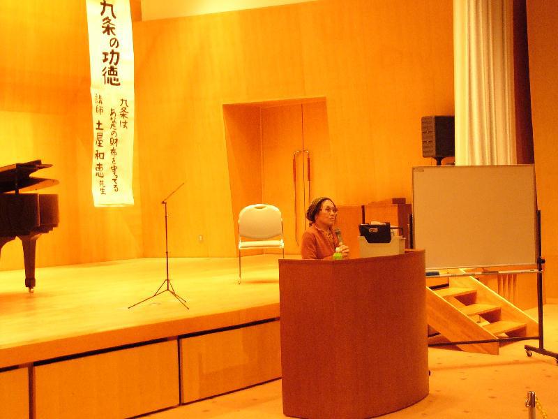 第2部は、山形大学名誉教授(羽陽学園短大講師)土屋和恵さんから「九条の功徳」と題して、日本国憲法が果たしてきた役割、とりわけ九条効用について、辛口にユーモアを交えてタップリ1時間話しされました。