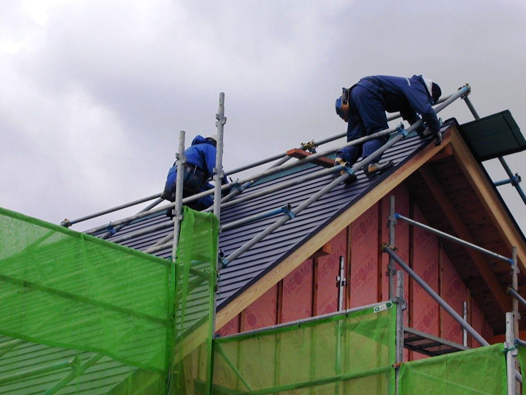 内装材として最もよく使われている材料は、石膏ボードでしょう。(写真は下地材に石膏ボードを取り付けている途中です。)