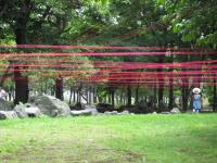 写真ではわかりにくいですが、最近お得意のピンクの水糸を水平に保ったまま、無数に木と木の間を往復させ、もう一つの水平線(面)を制作しました。