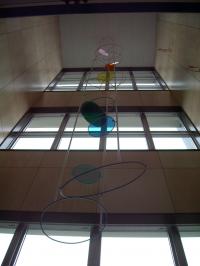 まだ開校前まので、公表できませんが、某新築中学校の吹き抜け部分に全長10メートル近いモビールを取付けました。
