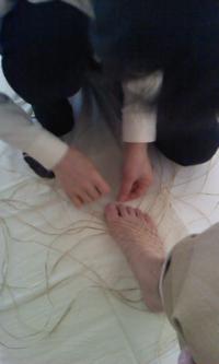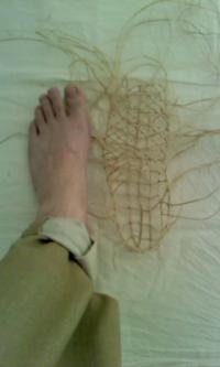 その後、同じ出品者でもあります田村陽子さんのお誘いを受け、作品制作のお手伝いです。 人々の足を葦のような植物で編み、足形をとる。という作品で10年目にして78名。 私で79人目だそうです。 長い間取り組まれている作品の一部に指名され、嬉しい限り。 この日は、右足が完成。 今週末は、左足です。時間は決まっていませんが、会場の隅で実演制作していますので、制作現場が見れるかもしれません。 ちなみに、こちらの美術館のミュージアムショップには、私のクラフト小物を販売しています。 もちろん見学のみも。 たまのお休みのドライブコースにおすすめですよ。 |