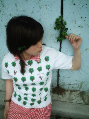 規則的に並ぶ木のプリント。 鮮やかなグリーンが元気いっ ぱいの印象をあたえます。例えば・・麻の七分丈ぐらいのワイドパンツと組み合わせてプリントをメインに見せてもかわいいですよね。逆に写真のように赤のギンガムとかと柄物同士で組み合わせればポップでキュートな印象に。
