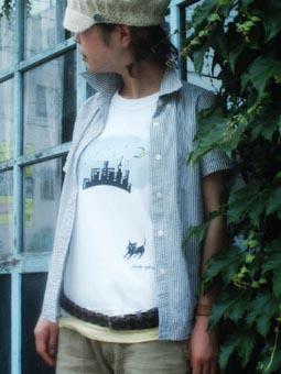 都会の猫をイメージしたTシャツです。コンセプトとしては、あまり主張しすぎないプリントを意識してあります。写真のように、パステル系の物と重ね着すると一段上のコーディネートができそうです。それからロマンティックとかトラッドなラインのボトムとなら「相性良し」かと思われます。