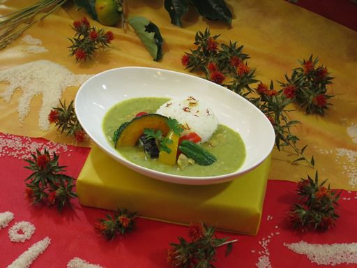 『べにばなグリーンカレー』750円が新メニューとして登場!、10/9(木)~2月までの期間限定メニューです。紅花若菜の緑を活かしたカレールー、紅花乱花をライスにちらし、さらに白鷹産野菜をふんだんに使い、お皿の中で紅花を表現したイチ押しのメニューです。