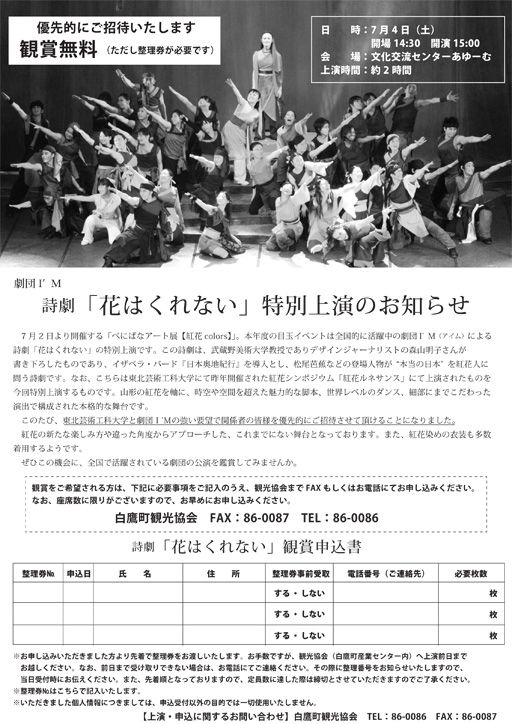 7月4日(土)に劇団I’Mによる「花はくれない」が上演されます。紅花を中心に細部にまでこだわった、演出や音響、ダンスも組み込まれている、本格的な詩劇です。