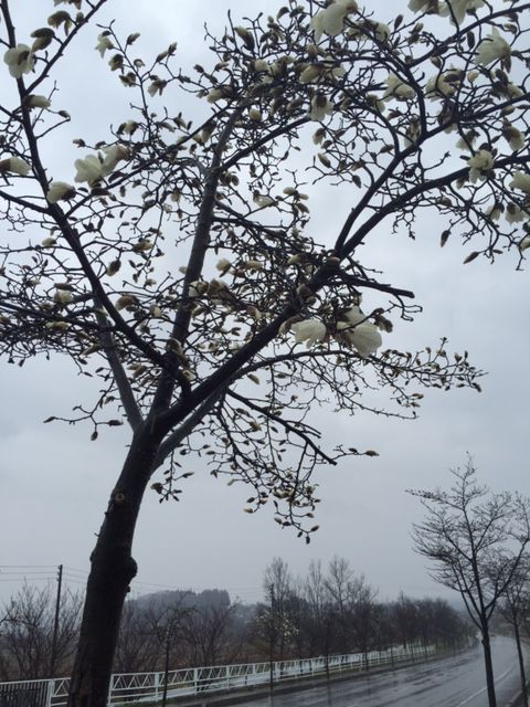 雨の日の画像で申し訳ありませんが、こぶしはだいぶ咲きはじめています。
