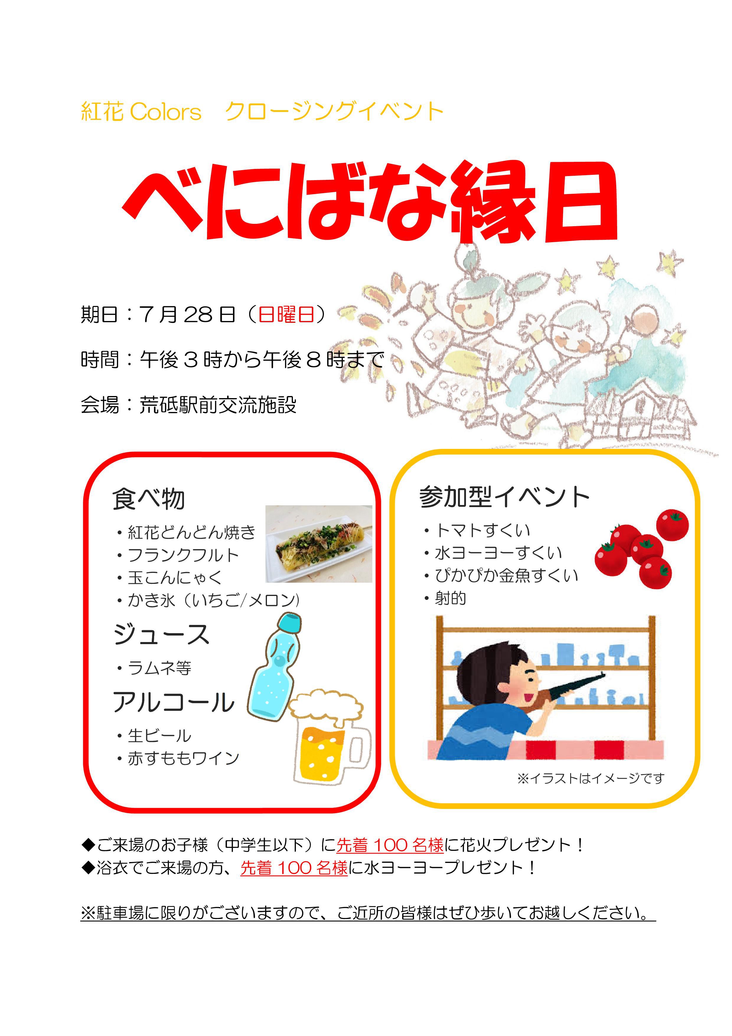 紅花Colorsの最終日にクロージングイベントとして、べにばな縁日を開催します。