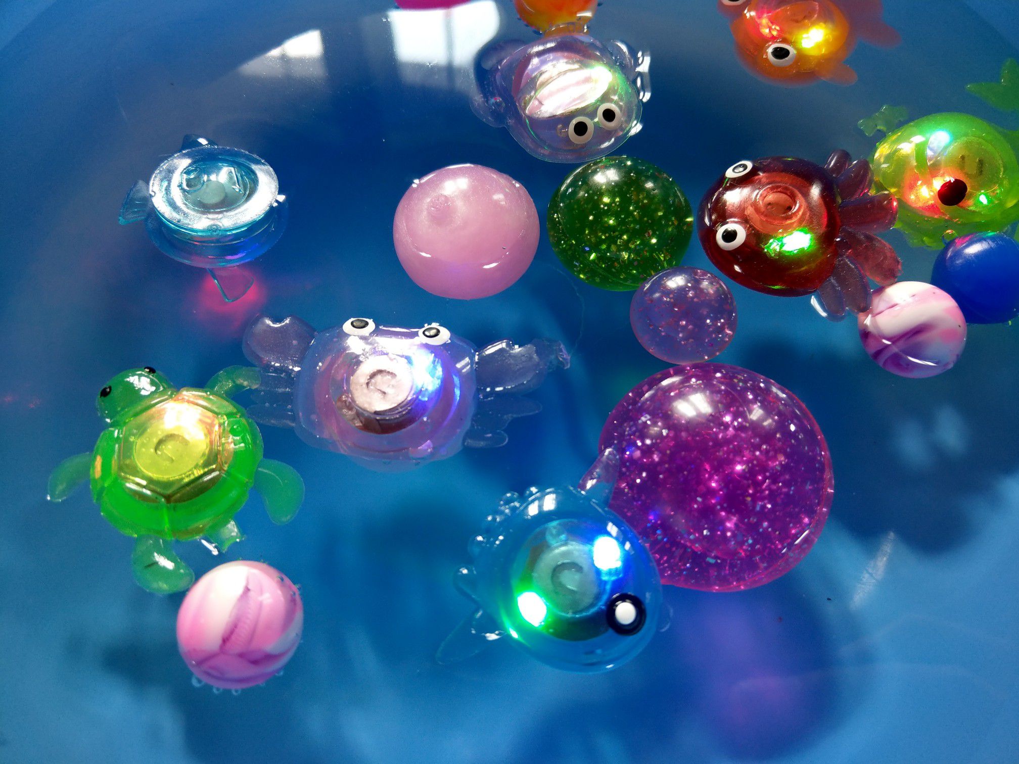 いま大人気の電池式でぴかぴか光る金魚のおもちゃ(金魚以外もたくさん)とおなじみのスーパーボールをご用意しました。