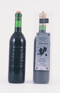 4月の発売なのに年末まで開封することが許されない、契ワイン「millennium」(赤)。「契」初の本格的な赤ワインでした。画像右側が封印前、左が封印後の「millennium」。「バイ」の梵字で封印され「このワインは1999年12月31日12時59分に開封を許可します。M.Kuwabawa 」のメッセージに、ひたすら大晦日を待ちました!