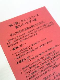 直江バースデー便の「薔薇の花」の説明書です。「水切り(茎の端を水に入れ、1〜2センチを切り落とすこと)」も覚えましたね。薔薇の香りに包まれての直江のバースデーはいかがでしたか?