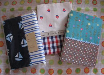 ほんとHPやブログを見てのお客さんが多いそうで、お知らせ ばしばししてかないとですね〜。 NEWデザインは二つですが、ぜんぶで3種類納品しました。 好評のマリン柄ブックカバー【red】(画像:真ん中)の他に 新しく【blue】(画像:左)のマリン柄ブックカバーを作って みました。 【マリン柄ブックカバー【blue】ハードタイプ 1300円】 こちらは芯地が入っているハードタイプで、表にポケットつき。 しまうほどでもない切符やメモなど小さいものなど入れてみたり、ね。 布を6種類も使って、ちょっと凝った作りになってますよ☆ そしてもうひとつ、ピーコックグリーンの花柄にブラウンの水玉、 ブルーの山並みテープのアクセントをつけたブックカバー (画像:右)です。 【ピーコックグリーンとブラウン水玉のブックカバー 1200円】 カラフルな鳥のテープはShinji Katohさんデザイン。 個人的には裏地の水色・ブラウンのタテボーダーの布が お気に入り☆この色合いとボーダーが大好きデス。 他にも、エコバッグを3点。 …つづく。 ...もっと詳しく |