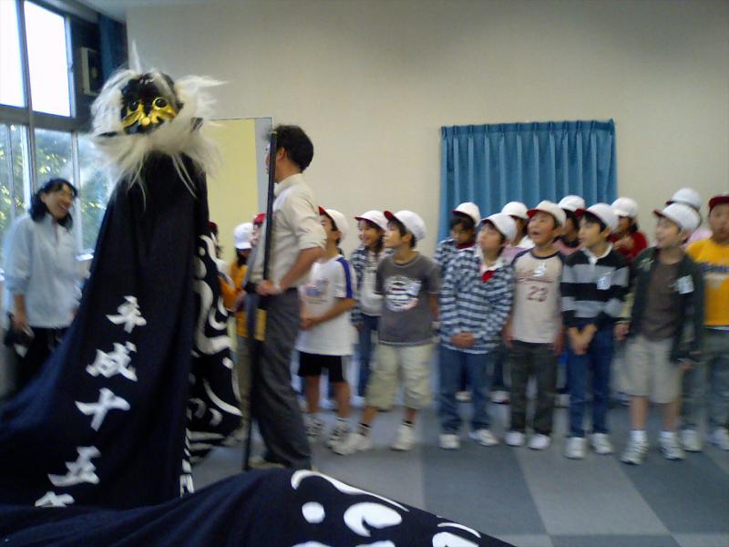 三年生の見学です。ちょっとからかって獅子幕で巻いてやりました。キャーキャーと大喜び!幕に入ってくる子供もいました。こういった楽しさも体験して欲しいね。