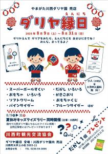 8月中、園内の売店にて、お子さん向けの「ダリヤ縁日」を開催します。チラシの右下にある半券をお持ちいただくと、駄菓子を1つプレゼントします。