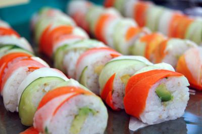 ・そばロール ベジタリアン寿司 ■材料 ・むきそば ・米 ・米酢 ・塩 ・人参 ・きゅうり ・アボガド ・大根 ・豆乳 ・ねり胡麻 ■作り方 1)むきそばを入れたごはんを炊く。 2)人参・きゅうり・大根を酢漬けにしておく。 3)アボガドを芯にし、野菜を海苔変わりにして巻き寿司をつくる。 4)豆乳とねり胡麻を合わせたソースを添える。 夏野菜まつりより(レシピ提供:よねおりかんこうセンター) |
