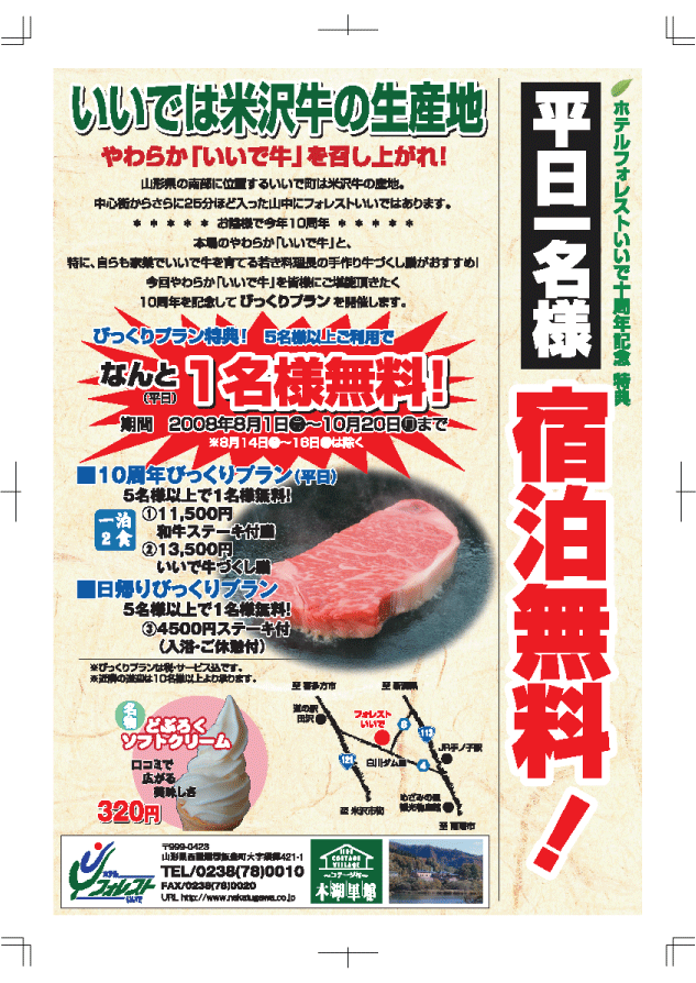 フォレストいいでは今年10周年を迎えております。これを記念して10月まで平日5名様以上1名様無料プランを開催致します。どこに行こうか迷っている方是非おすすめのプランです。味よし、景色よしのフォレストにこの機会是非起こしくださいませ。芋煮会にどうぞ。