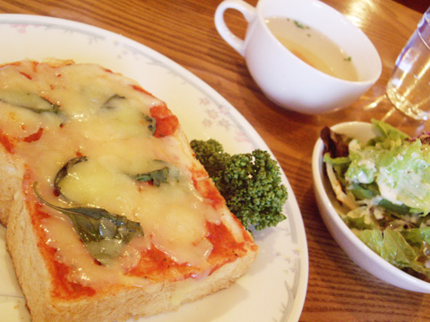 こちらは「マルゲリータトースト 400円」に、 プラス150円でスープサラダをセットにしました! 他にも「ガーリックトースト」や「ハニートースト」もありますよ〜