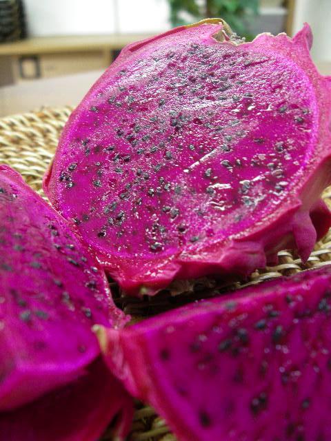 キウイのような食感でスイカのような甘さがあります。胡麻のような種は食べられます。白のドラゴンフルーツはほのかに酸味を持つ場合がありますが、赤のドラゴンフルーツはだいたい安定した甘さがあります。