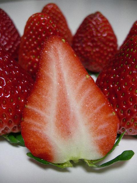 濃い赤色、まるい実、大きく、つやがあり、甘くて、うまい!