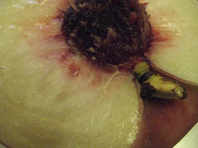 果肉は白色で、核のまわりだけ赤く色付きます。