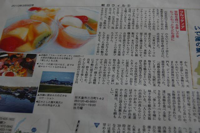 宮城県全域と山形県村山・最上エリアの朝日新聞購読家庭に朝刊折り込みで無料配布される情報誌で、第2・第4週の火曜日、15万部を発行されている、朝日ウィルの2010年3月9日号「山形ゆうゆう食楽記」K天童市特集に載せていただきました。記事内容をPDFでご覧になれます。「果物を食べる楽しさをもっともっと子ども達に」