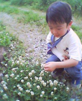 モデルは孫の成海くん(3歳)。お父さん達の世代には懐かしい「しろつめ草の花が咲いたらさあ行こうラスカ〜ル」のフレーズを口ずさみつつお花摘み(^-^)。