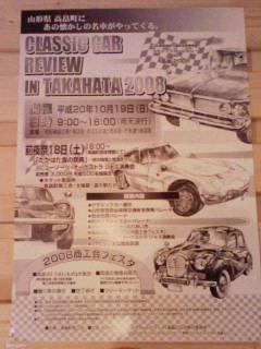 毎度です。いつも見ていただきありがとうございます。秋も本番になりつつある今日ですが、明日は2年に一度の「クラシックカー 2008」がこの高畠町で行われます!!日本の旧車をはじめとする世界の名車が約160台集まりイベント・パレードをします!!日本全国から旧車を愛する方の素敵な企画、今回出展する車の中で一番古いのは昭和23年式ロールスロイスだそうです!!現役でバリバリ走っているツワモノです!!そんなイベントにBONDが出店してますので是非是非遊びに来てください!!一緒のブースに「DMサイン」さん(ピンストライプやエアブラシ作成など)も加わり、その場でいろんな物にペイントしてもらえるとても上手なアーティストですよぉ〜!!必見です!!イベントの模様もアップしますのでお楽しみに(^^)頼む!!今年最後の出店だと思うので晴れてちょうだい!!