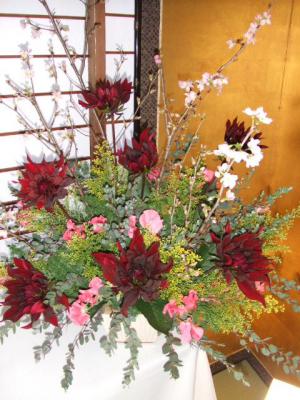 床の間のそばにも、桜とダリアのお花が生けてありました。