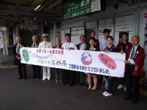 高瀬駅から出発です。駅では、高瀬小学校の児童たちが横断幕でお出迎えをしてくれました。