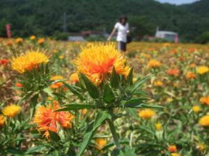 高瀬駅から約20分。本日のメイン、山形紅花まつり会場の高瀬紅花ふれあいセンターへ。初日とあって、たくさんのお客様がいらっしゃいました。こんなに暑いのに…