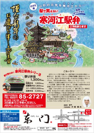 寒河江市では、特産品や観光名所をイメージした食べ物やお土産商品の開発を企画し、先日発表会が行われました。「お土産品」「スイーツ」「食」の3部門のうち、東門では「食」の考案を担当させていただきました。駅で買えない寒河江駅弁(1300円)は、秋の風物詩となっている祭り「神輿の祭典」などを踏まえ、季節の食材や名物の焼き鳥、出店に並ぶ「どんどん焼き」などを内容に盛り込んでおります。