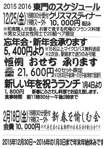 年末年始の営業状況についてお知らせいたします。 2015年12月30日〜2016年1月3日の間は、お休みをさせていただきます。 恐れ入りますがご了承くださいませ。 |