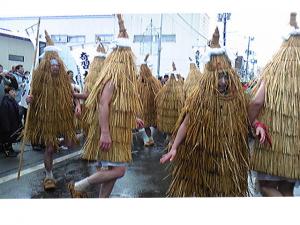 アップした写真をご覧ください。 この みの姿の集団!!を最初に目撃したときのわたしの驚きと楽しさと その感想は 「ゲゲゲのきたろうに登場してきそう!! 」でした。 みなさんもそう思いませんか?? ある種の異様な雰囲気をかもし出していますが、 会場には、「カッカッカ〜のカッカッカ〜」という威勢のいい掛け声がかかり とても盛り上がっていましたよ。 なぜ「カッカッカ〜」という掛け声なのかは、分かりませんが これは、上山市で行われている「カセ鳥」という小正月の民族行事です。 商売繁盛など祈って、 みの姿の「カセ鳥」達が威勢のいい掛け声とともに街の中を練り歩きます。 火ぶせを祈願するという意味も込められているため カセ鳥達は、この寒い中、なんと沿道から次々と水を浴びせられます。 沿道の子供の中には、雪を混ぜた「氷水」を準備している子もいて カセ鳥達がゴールに到着する頃には、体が真っ赤になり、とてもかわいそうな状態になっていました・・・。 でも、フィナーレの乱舞も黒山の人だかりで大盛り上がり。 最初は、異様な雰囲気だなと思っていたみの姿も、ずっと見ているうちに なぜかかわいくみえてきました。 片足をあげて、「カッカッカ〜」とぴょんぴょん飛び跳ねる姿は、 ダンディーなおじ様もかわいくみえてしまうんです。 これって、みの効果?ただの錯覚?? また、ゴール地点には、熱々の「寒たら汁」が用意され、 こちらも大盛況で、長い行列ができていました。 わたしは、味わうことができませんでしたが 子供から大人まで、とても美味しそうに味わっていました。 みなさんも、来年、ぜひ上山に足を運び、生カセ鳥をご覧になってはいかがでしょうか??熱気ムンムンできっと楽しめるはずです。 |