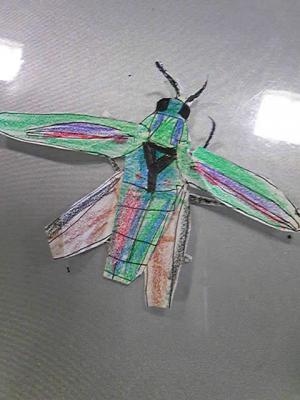 三沢コミュニティセンターに併設されている、昆虫の博物館です。 現在は、宝石のような美しい虫ばかりを集めた企画展が行われて いますので、ぜひみなさんも足を運んでみてください! さて、よねざわ昆虫館の専門員・島貫さんに出演していただいてるのが 四丁目マーケットの「教えて!島貫さん」のコーナーです。 先日も、収録で昆虫館におじゃましたところ、お父さんと一緒に 展示を見に来た6才の女の子に出会いました。 そして、その女の子が持っていたのが、写真のタマムシ!! 紙に色鉛筆で色がつけてあって、しかも羽が開くという仕掛け付き! 何かお手本を見て作ったわけではなく、その女の子のオリジナル なんだそうです!! 観察眼と想像力、器用さにびっくりしちゃいました☆ 他にも、紙昆虫のコレクションがあるとか…。ぜひ見てみたい!! |
