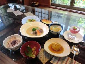 具沢山の豚汁や、地元のお豆腐、季節の果物などなど。