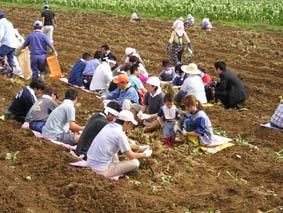 ご無沙汰しておりました。日記の書き込みをしようしようと思っていたら、もう9月!忙しさの余り書き込みするのを忘れておりました。すみません。っと、そんなところで今日は本番で使う里芋の芋堀です!!市内ボランティア、自衛隊さん、生産者の方々、農協さん等など、総勢約150名で頑張って行いました。