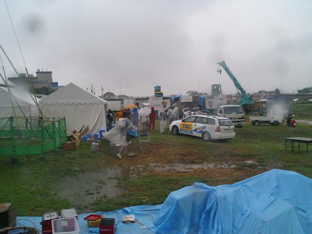 安全祈願が終わり、準備に取り掛かったとたんの土砂降り。