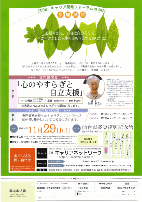 2008キャリア開発フォーラムin仙台を開催します。★主催:キャリアネットワーク★日時:11月29日 ...もっと詳しく